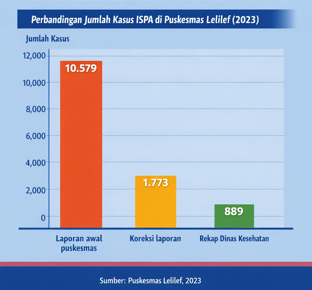“Jadi kemungkinan data itu (10.579) dari surveilans, bukan dari kami,” ujar Pengelola Program ISPA Puskesmas Lelilef, Frida Hasan. Data yang disusun oleh Frida sebanyak 889 kasus.