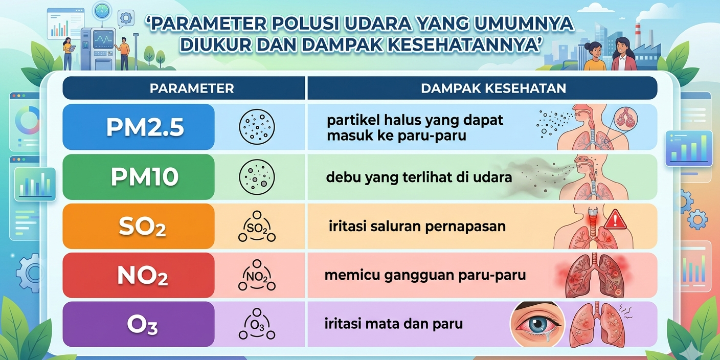 Padahal dalam pengujian kualitas udara, sejumlah parameter penting biasanya diukur secara berkala. Di antaranya adalah PM2.5, PM10, serta gas polutan seperti sulfur dioksida (SO₂) dan nitrogen dioksida (NO₂).