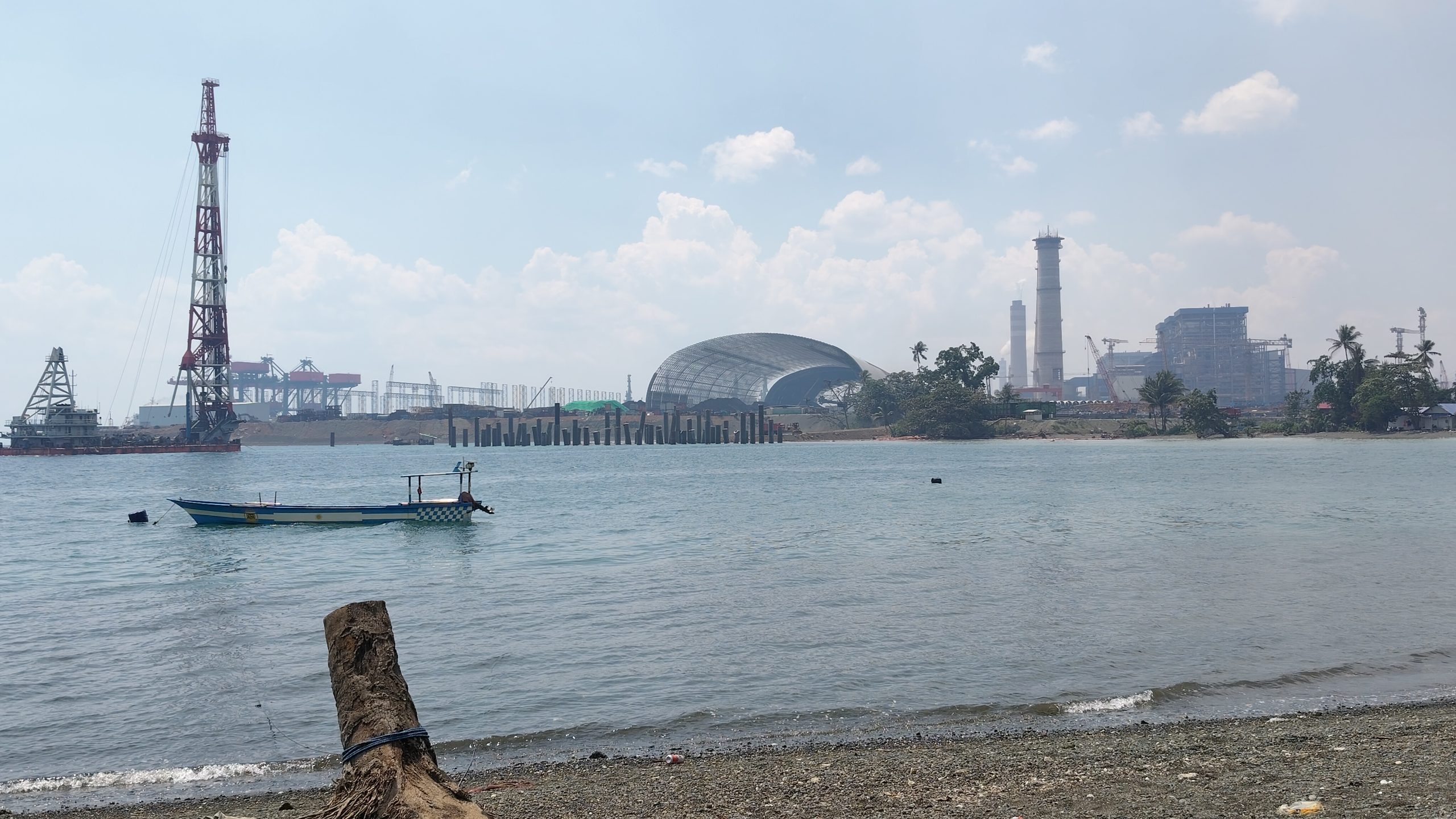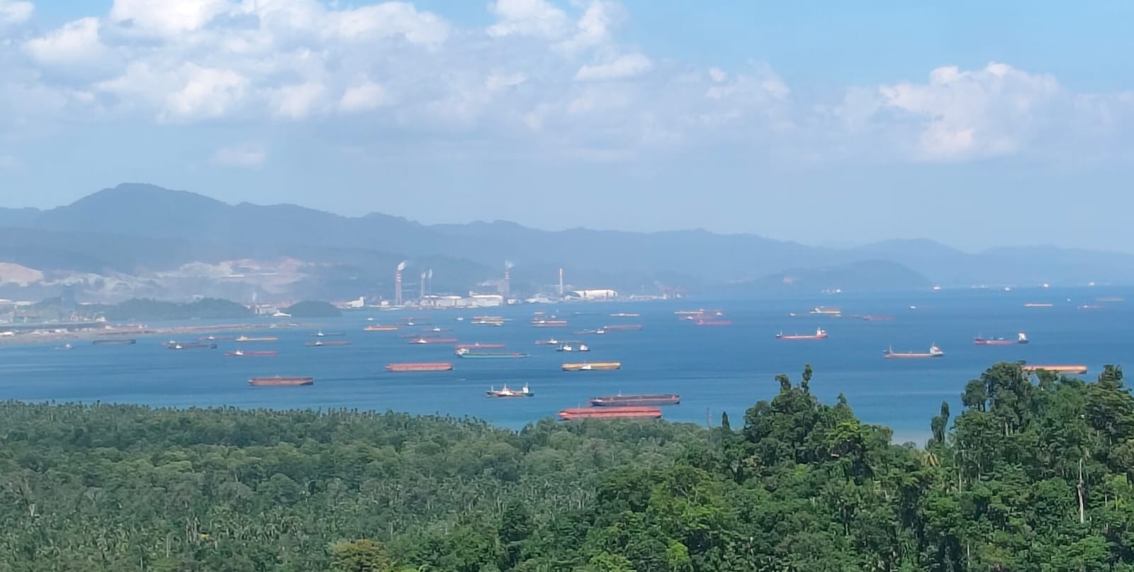 Di sekelilingnya, truk pengangkut bahan tambang hilir mudik menuju area smelter. Ratusan kapal tongkang pembawa batubara, ore nikel, hingga material industri berlabuh di perairan teluk menunggu giliran bongkar muat.