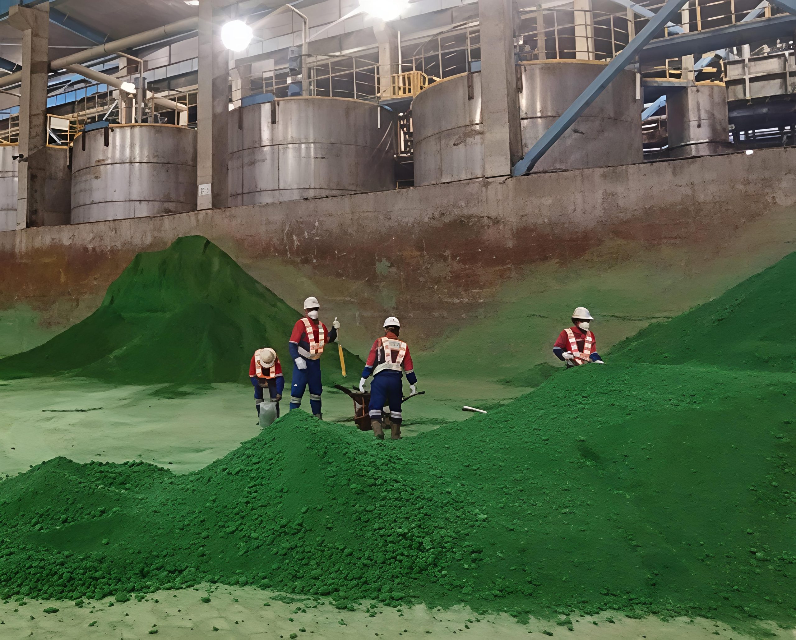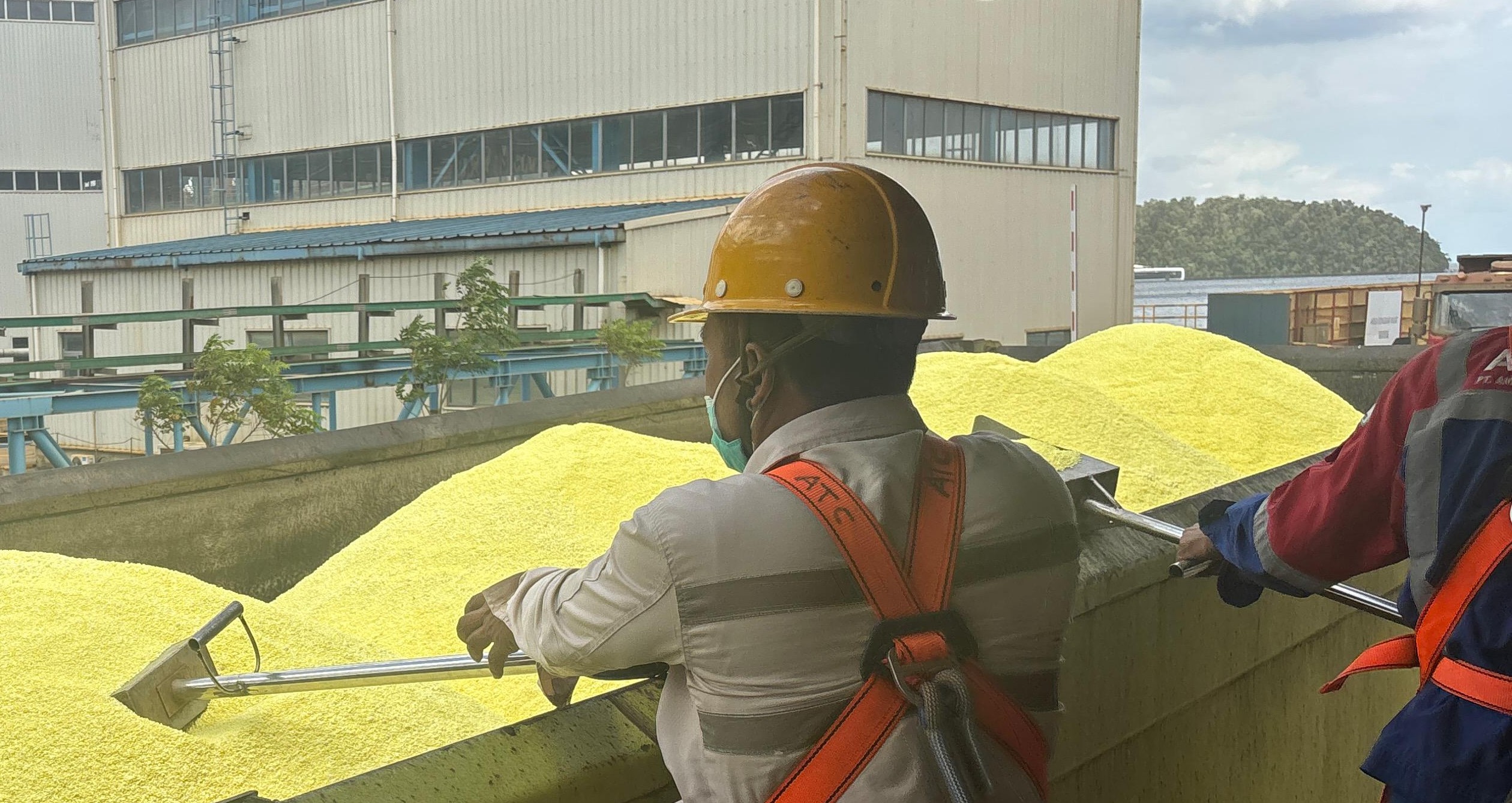 Para pekerja mengeruk belerang di kawasan industri nikel Halmahera Tengah. Foto: Istimewa